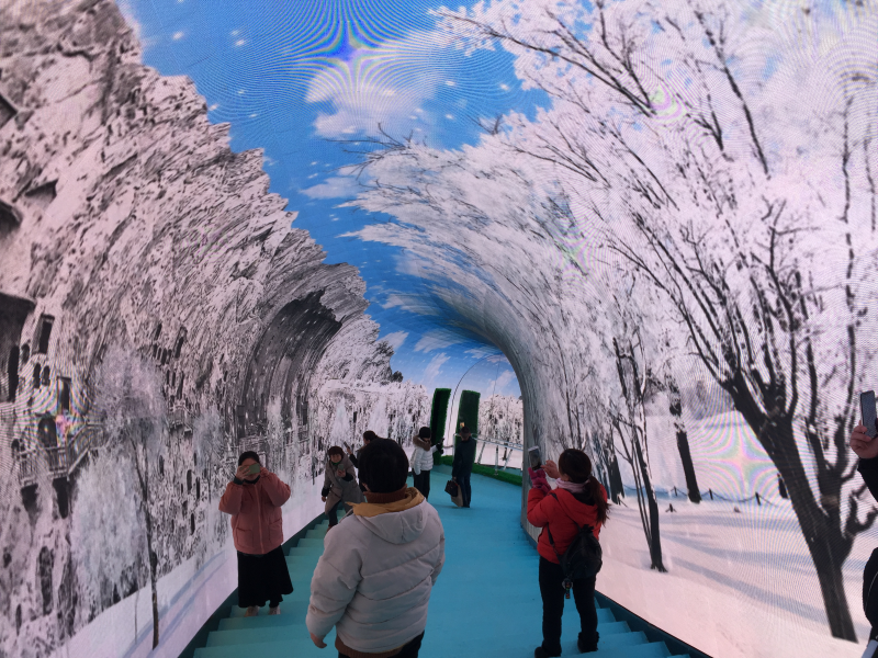 森林、冰雪、......不停变化的美景让人迷醉,这一沉浸式时光隧道仿佛吞没了一切,炫酷神秘的视觉效果吸引着众多游客慕名而来,成功跻身洛阳又一网打卡地,成为倒盏村打造文旅融合的重要输出窗口之一。