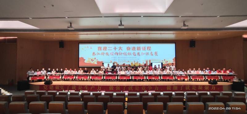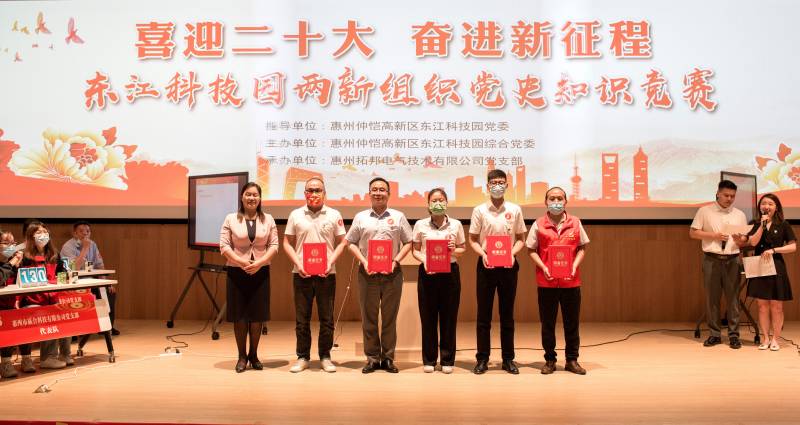 4月28日,由东江科技园两新组织举办,以“喜迎二十大、奋进新征程”为主题的党史知识竞赛正式开赛,来自园区党委委员班子成员以及14支两新党支部代表队参加竞赛。经过紧张激烈的角逐,星空电竞光电党支部代表队以优异的成绩荣获第三名。